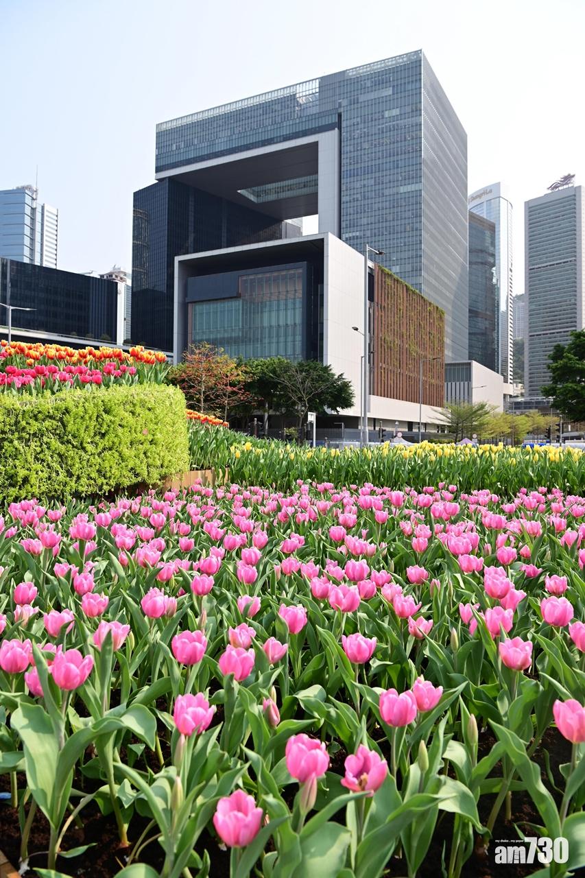 一向備受市民和攝影愛好者歡迎的鬱金香花圃,設置於中西區海濱長廊(中環段),約1.5萬株色彩繽紛的鬱金香。(政府新聞處)