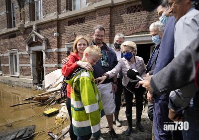 布拉瑟爾一家逃過一劫,昨與視察災情的歐盟委員會主席馮德萊恩(中)攀談。(美聯社)