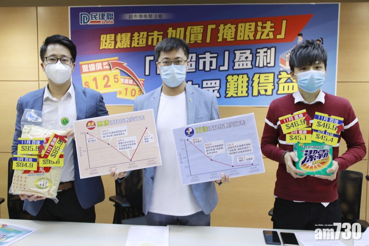 民建聯超市價格關注組記者會。圖左起:司徒駿軒、顏汶羽、何坤洲。(林俊源攝)