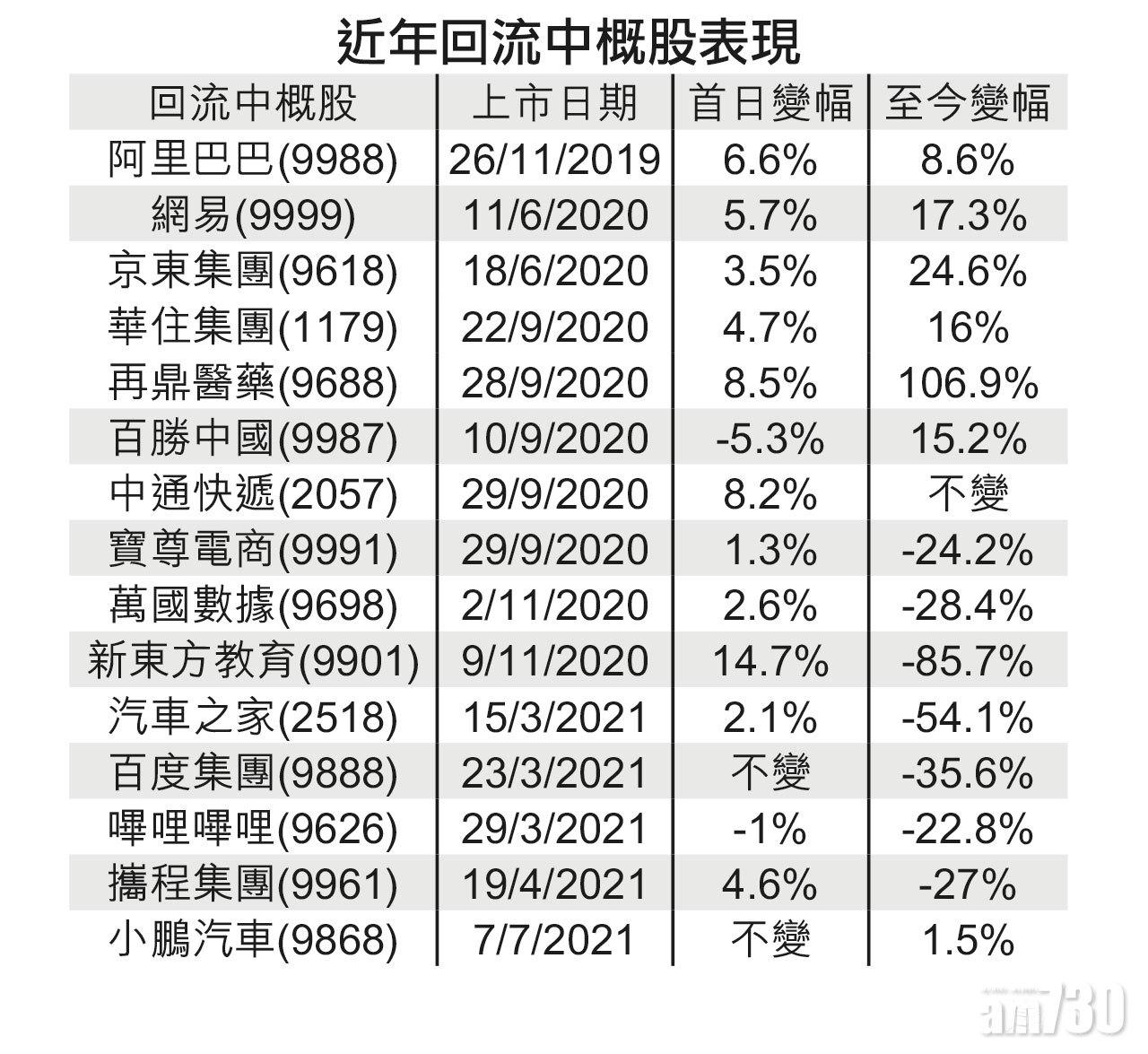 除了首日上市表現漸失色,在內地監管風暴下,近年回流香港第二上市的中概股中長線表現亦失色,4月中掛牌的攜程集團(9961)至今累瀉27%,嗶哩嗶哩及百度亦分別累跌23%及36%。