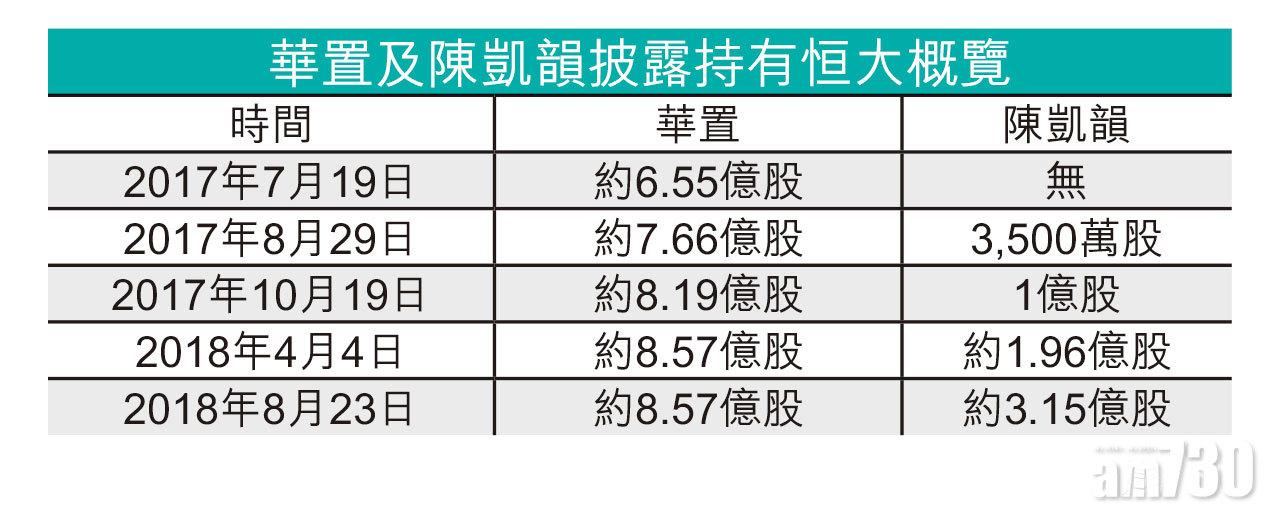聯交所股權披露顯示,陳凱韻(甘比)沽出該批恒大股份後,其持股量由約11.93億股,減至約11.87億股,股權由9.01%,降至8.96%。以恒大昨日收市價4.36元,市值約51.7億元。然而,恒大爆出債務危機以來,股價持續向下,今年已累瀉七成,市值累計蒸發約1,400億元。華置自2017年7月中首次披露持有恒大5%後,其後亦多次增持股份,昨日甘比則首度披露減持相關投資。