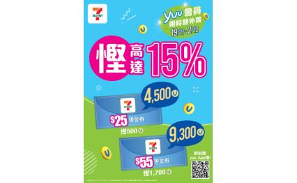 【yuu會員專享】兩週限時瘋搶優惠強勢回歸 以4,500積分兌換7-Eleven $25電子現金券 或以9,300積分兌換7-Eleven $55電子現金券 慳足高達15%