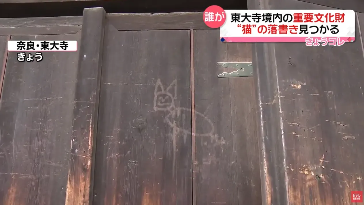日本奈良東大寺木門被破壞 不文明遊客疑用力指壓畫貓咪