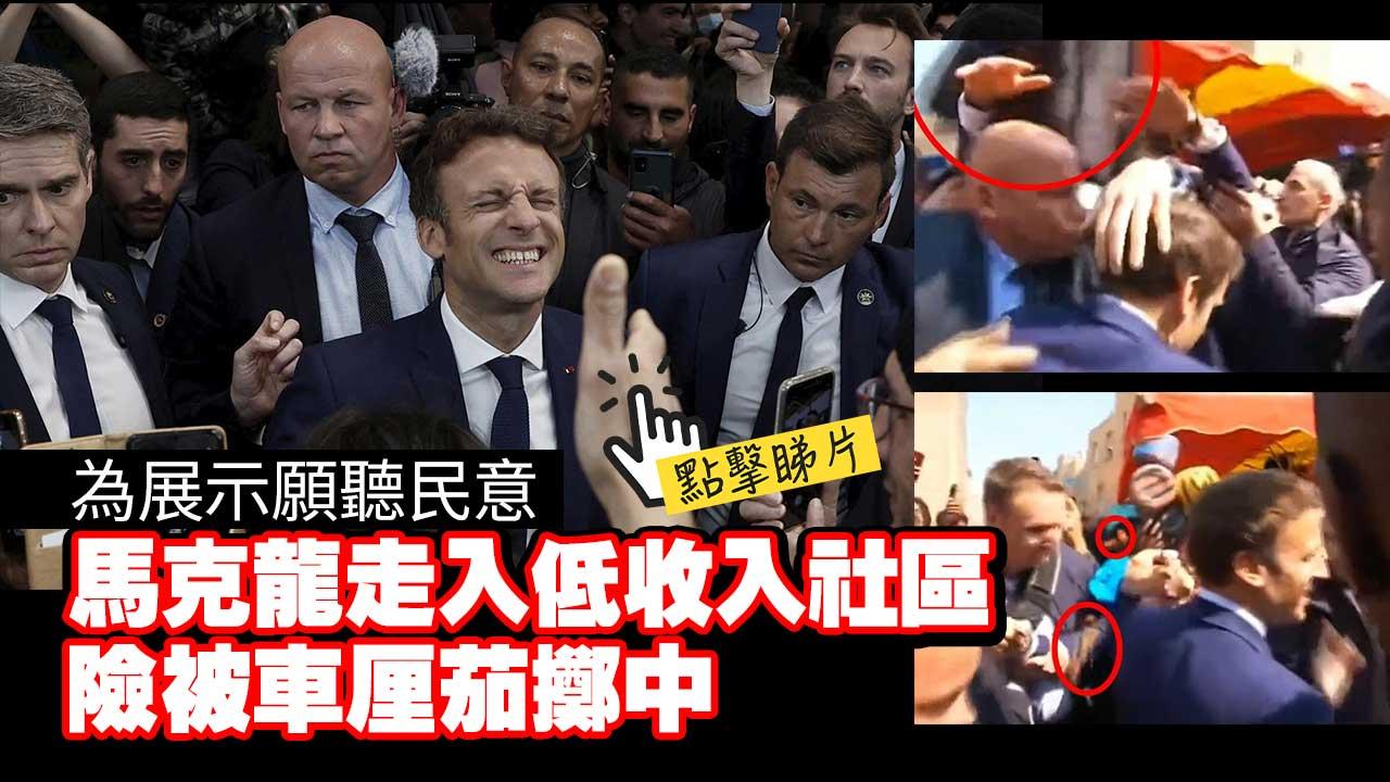 馬克龍成功連任後首度落區 險被車厘茄擲中(有片)