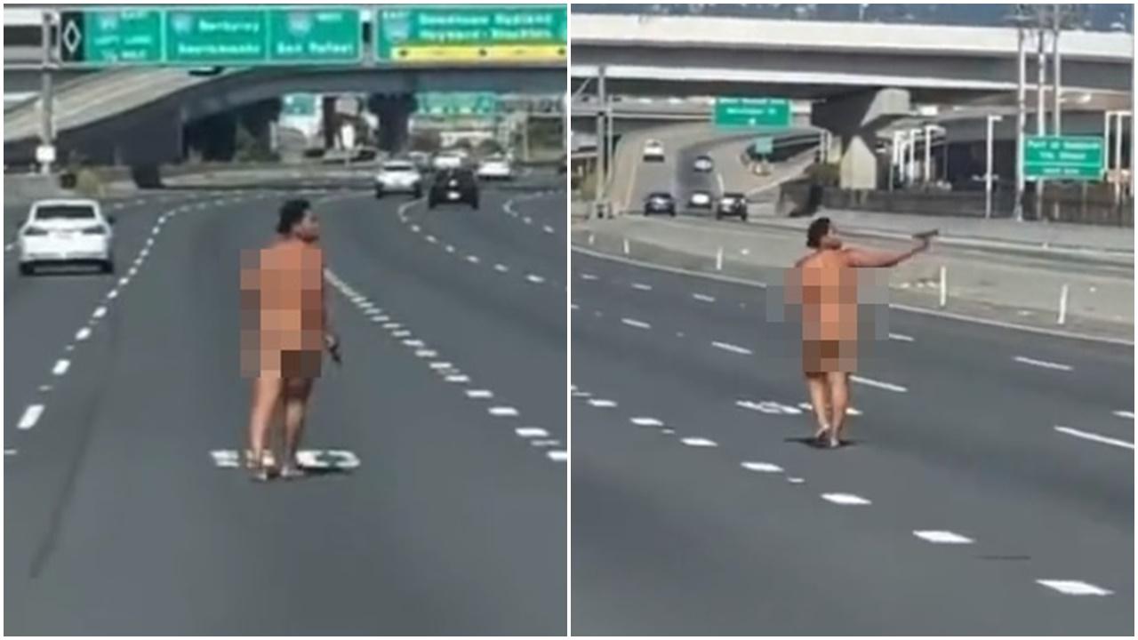 美國裸女闖大橋車道舉槍亂射 失控畫面曝光(有片)