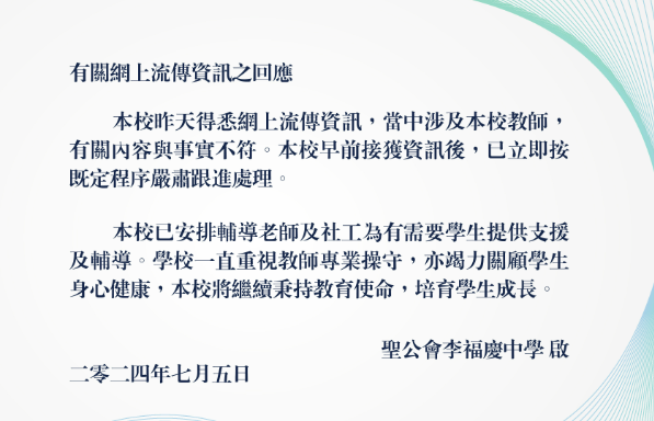 位於柴灣的聖公會李福慶中學今日在官網回應,校方昨得悉網上流傳資訊,當中涉及該校教師,有關內容與事實不符