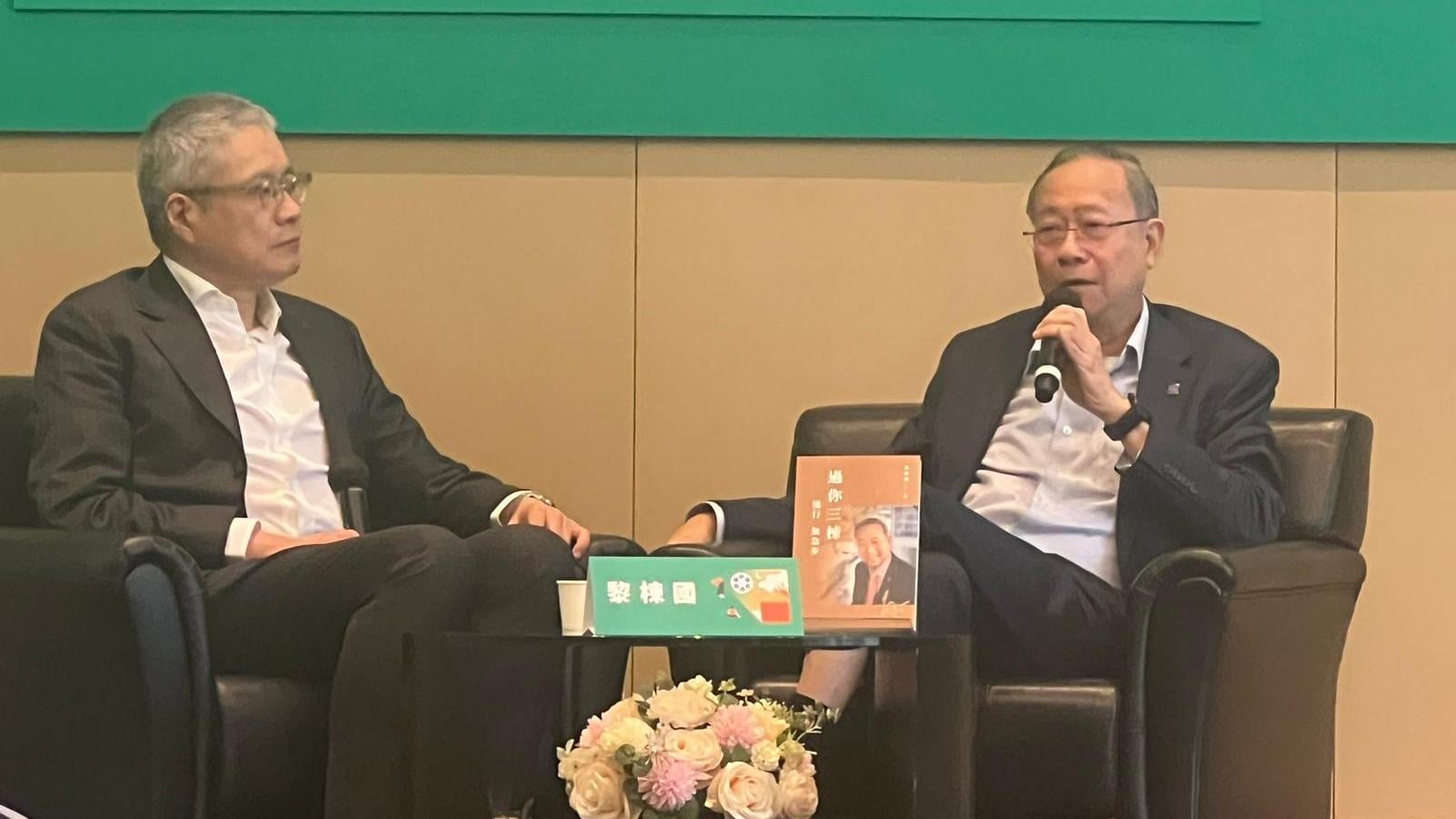 黎棟國(右)出席新書分享會,並邀來管浩鳴(左)出席。(江思嬅攝)