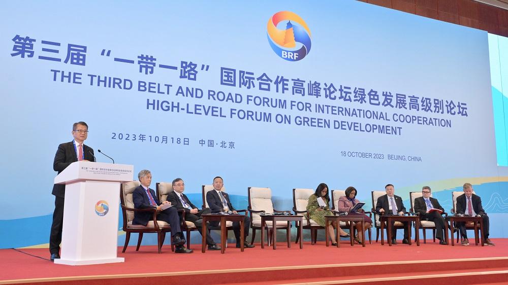 出席第陳茂波出席「一帶一路」國際合作高峰論壇綠色發展高級別論壇並在會上發言。(財政司網誌圖片)