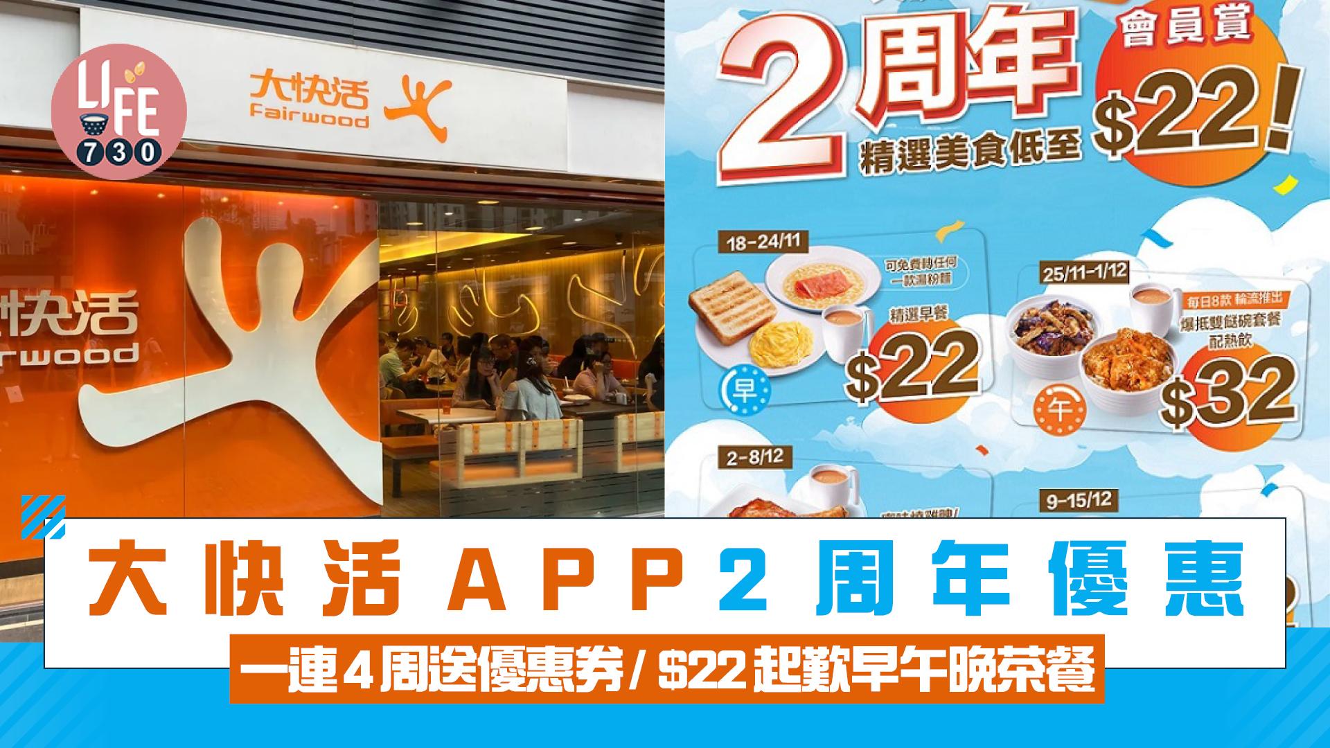 大快活APP 2周年優惠 一連4周送優惠券/$22起歎早午晚茶餐