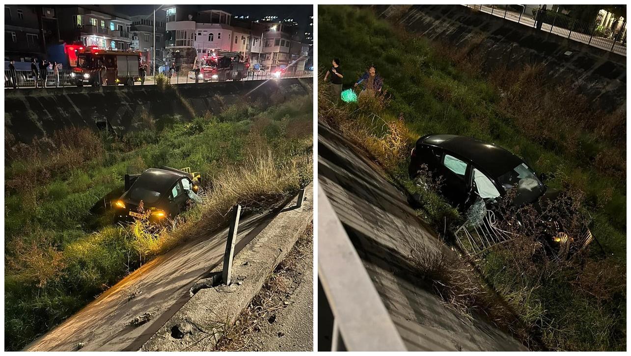 元朗Tesla自炒撞欄飛墮明渠司機受傷 由吊臂將車吊回路面