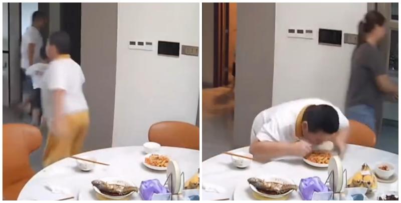 廣東清遠發生4.3級地震,一名男童跟著父親跑出大門後,又不捨未吃完餸菜,竟跑回頭「扒多幾啖」飯菜先走。(影片截圖)