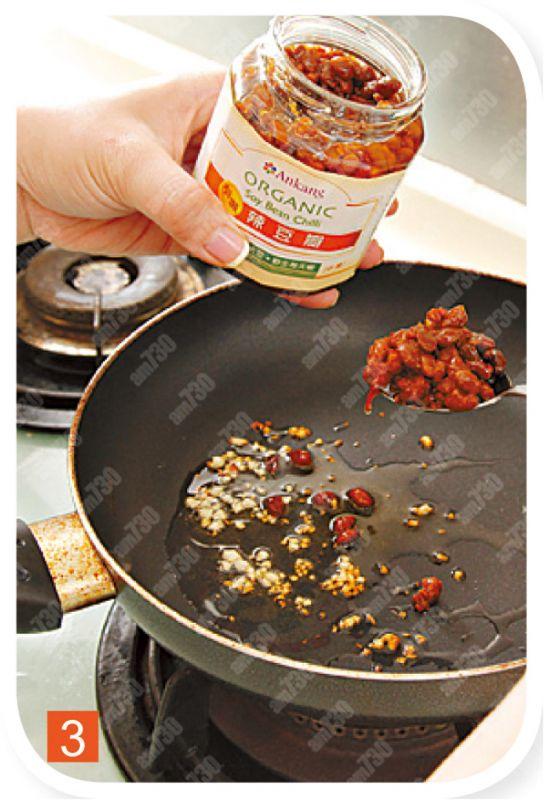 3.燒熱平底鑊,加入葡萄籽油,爆香蒜茸及豆瓣醬,加調味煮滾。