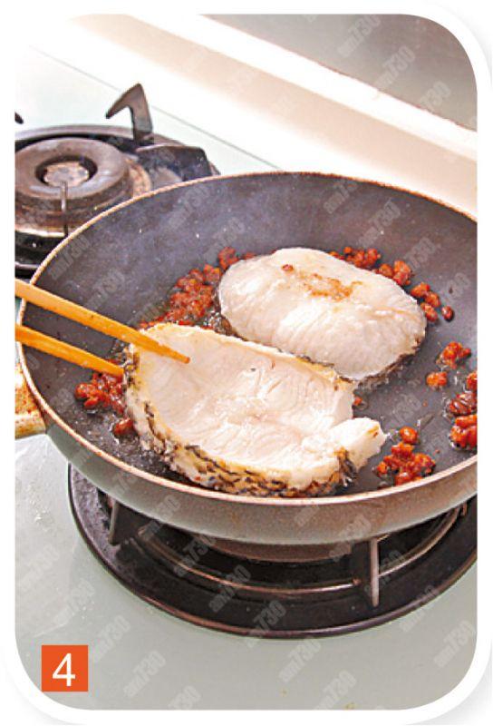 2.將銀鱈魚撲上少許粟粉,煎熟至兩邊魚身呈金黃色,撈起。