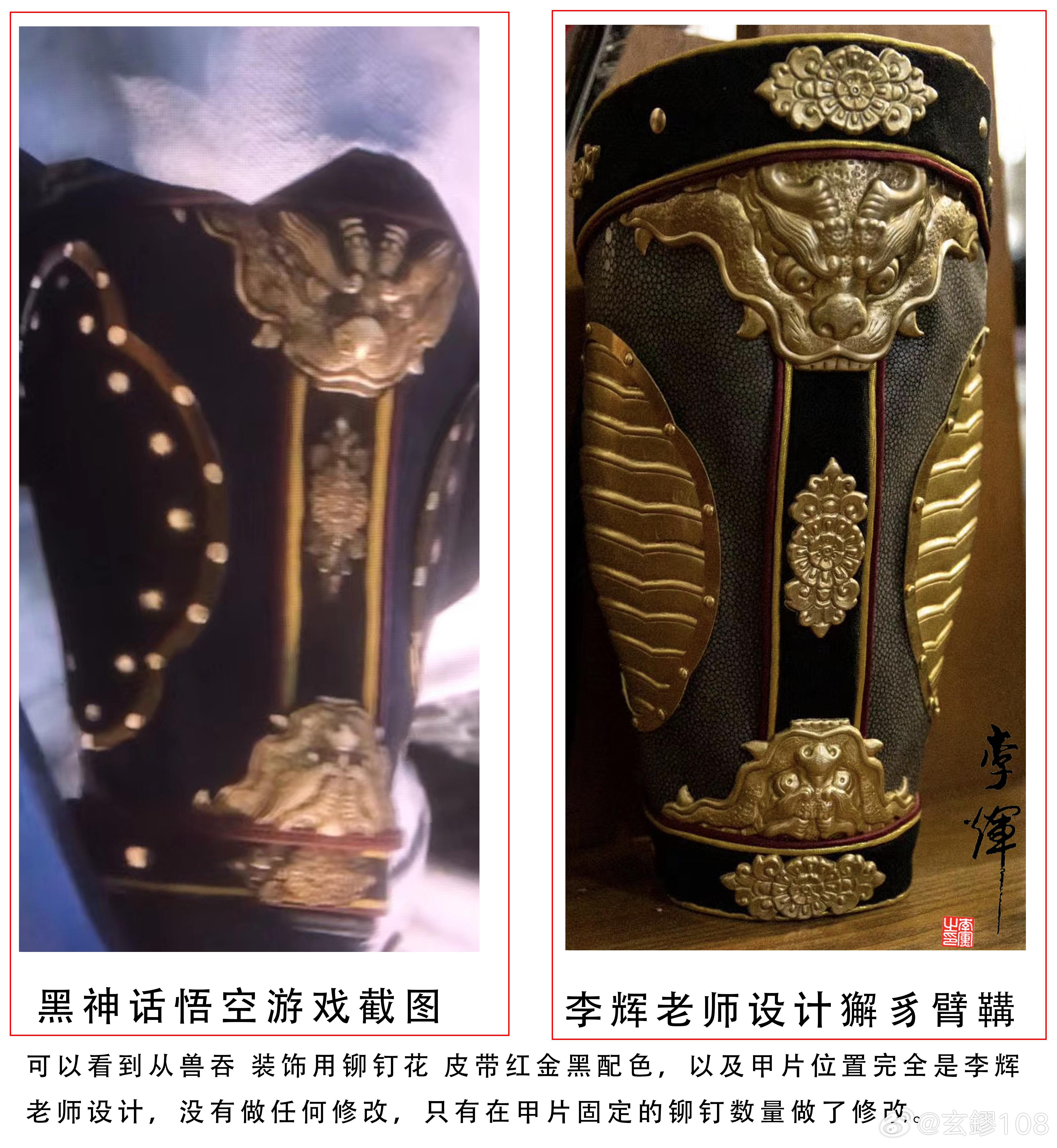 另外,有網友就發現,《黑神話》遊戲裡的楊戩角色所佩戴的臂鞲,竟與工藝大師李輝的作品獬豸臂鞲驚人相似,「希望有個說法」。隨後,李輝也在微博帳號「玄鏐108」貼出,遊戲中楊戩的臂鞲與自己過往設計的臂鞲作品的對比圖,並感嘆,「又被抄襲了,原創有那麼難嗎?手藝人的權益誰來維護?」據悉,李輝是中式甲胄藝術家、北京市工藝美術大師。