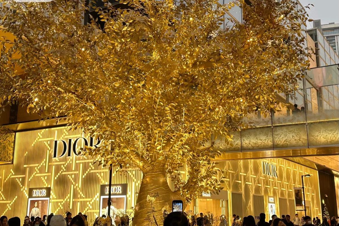 在深圳萬象城外,有一座金光閃閃的樹,晚上亮燈後金碧輝煌,令人一見難忘。這棵樹就是萬象城Dior名店前的聖誕樹,樹身樹葉全以金色包裝,又安裝了發光裝置,晚上亮燈後,金光閃閃,奪目耀眼,令人不期然合起雙手許願,可會一「摸」發財?