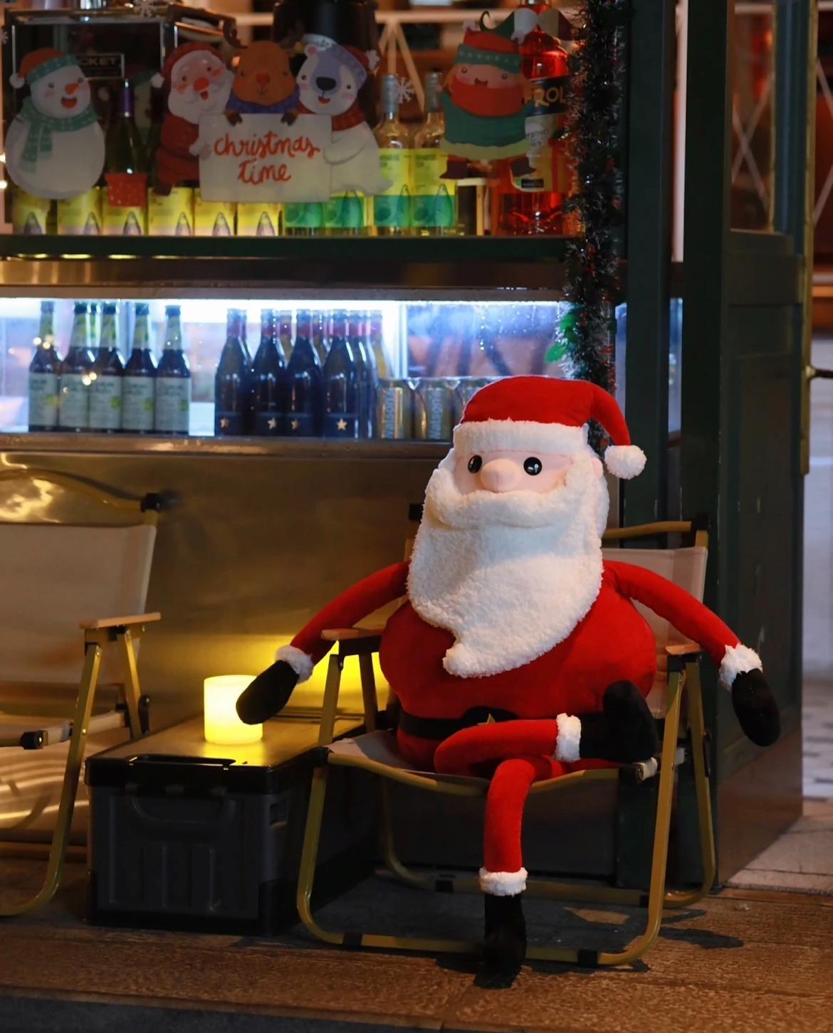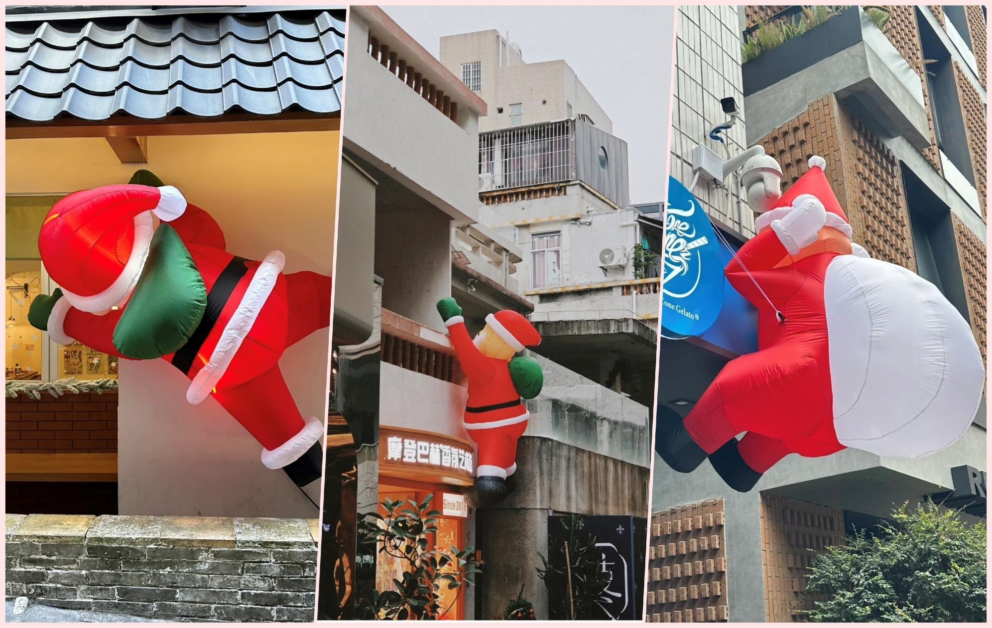 聖誕節的南頭古城,每一間店鋪都花心思布置,不少店鋪外牆都有同一系列的聖誕老人裝置,像在述說聖誕老人從屋頂煙囪派禮物的故事,是古城的主題打卡位。