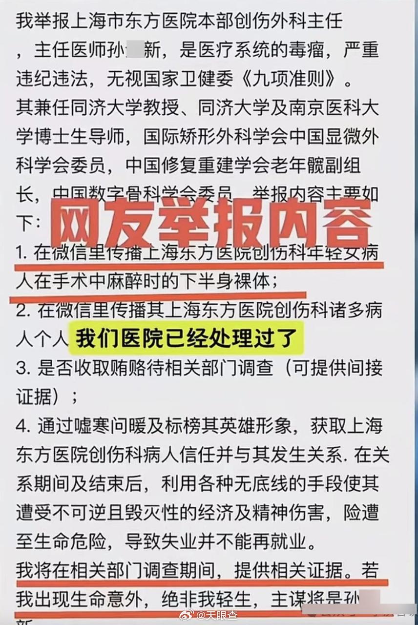 據多家內媒報道,3日,有網友實名檢舉稱,上海市東方醫院創傷外科主任、主任醫生孫某新私下傳播病人麻醉時裸照,以及180份病人手術訊息,還勾引病人上床,引發關注。