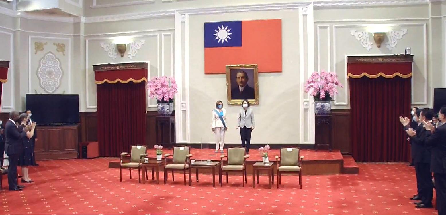 美國眾議院議長佩洛西今日展開訪問台灣的行程,在到訪立法院後,便到訪總統府,與蔡英文及賴清德會面,在會面開始前,蔡英文向佩洛西頒授「特種大綬卿雲勳章」,以表彰她對台灣長期的堅定支持,以及對提升台美交流的貢獻。國台辦發言人馬曉光形容是一場政治鬧劇。