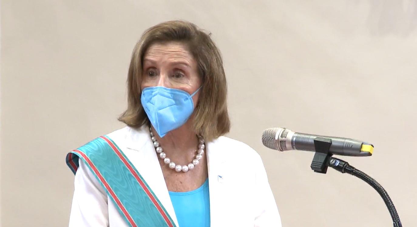 佩洛西表示,非常榮幸獲得勳章,她是代表美國議員一同虛心接受頒授勳章的殊榮,強調今次訪台展示美國不會放棄對台的承諾。她指台灣是一個由女性總統領導的自由地方,美台團結十分重要,重申全球安全、經濟繁榮及治理是她出訪的3大原因,美台在這些領域有許多合作空間,指世界面對民主與專制的選擇,美國對保護台灣的民主是堅定不移。