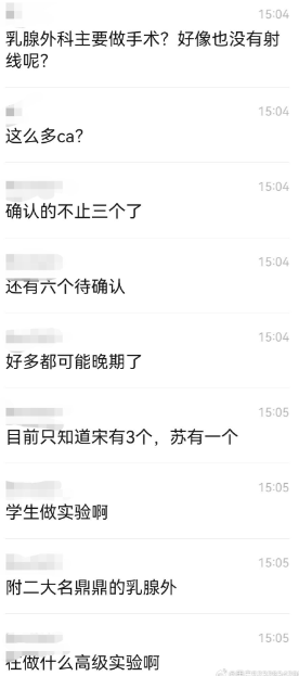 社交平台顯示,有人發布訊息稱,「中山二院蘇士成的學生集體罹患癌症」,均屬於乳腺外科團隊。另有消息指出:「今年乳癌那邊,6個學生罹患癌,有個還是胰臟癌肝轉移。」另有人指「3個博士、1個博士後,都小於30歲,全是罕見性」。