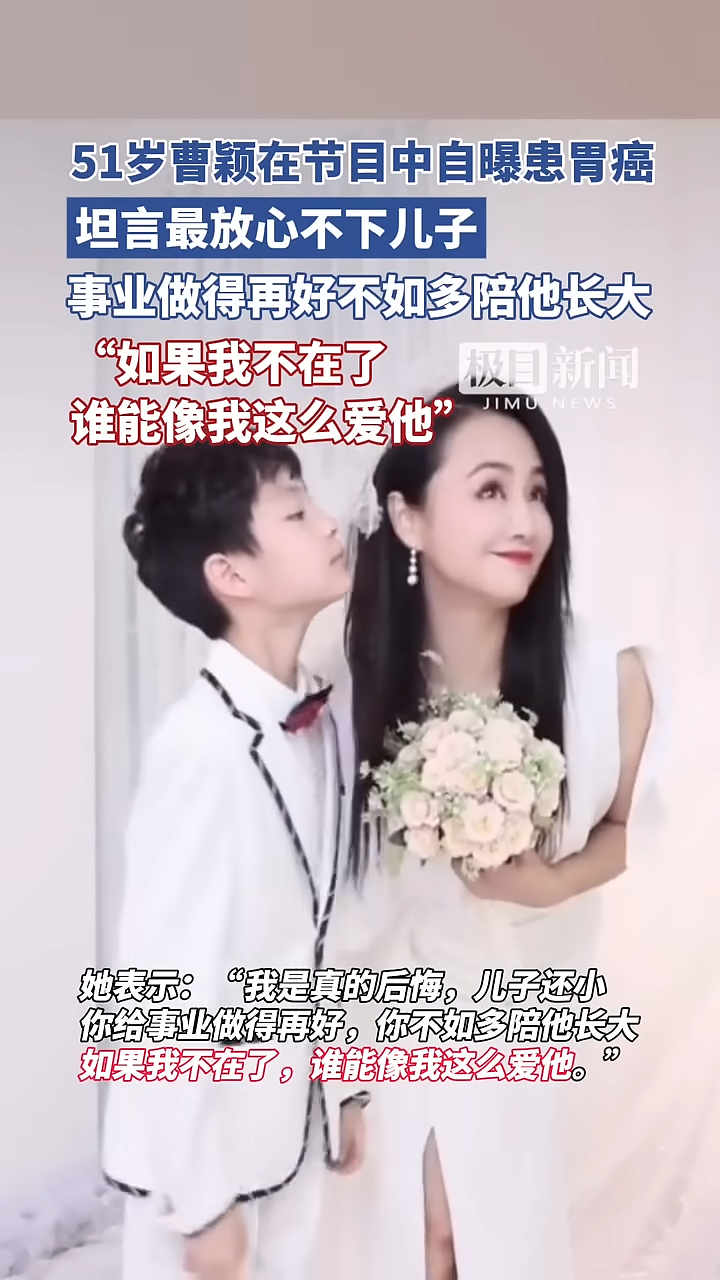 內地知名女主持人曹穎驚傳罹患胃癌,她近日在一個節目中,自曝罹患胃癌,她坦言,最讓她牽掛的不是事業,而是年幼的兒子:「我是真的後悔,兒子還小,你給事業做得再好,也不如多陪他長大。」消息曝光網友唏噓不已。