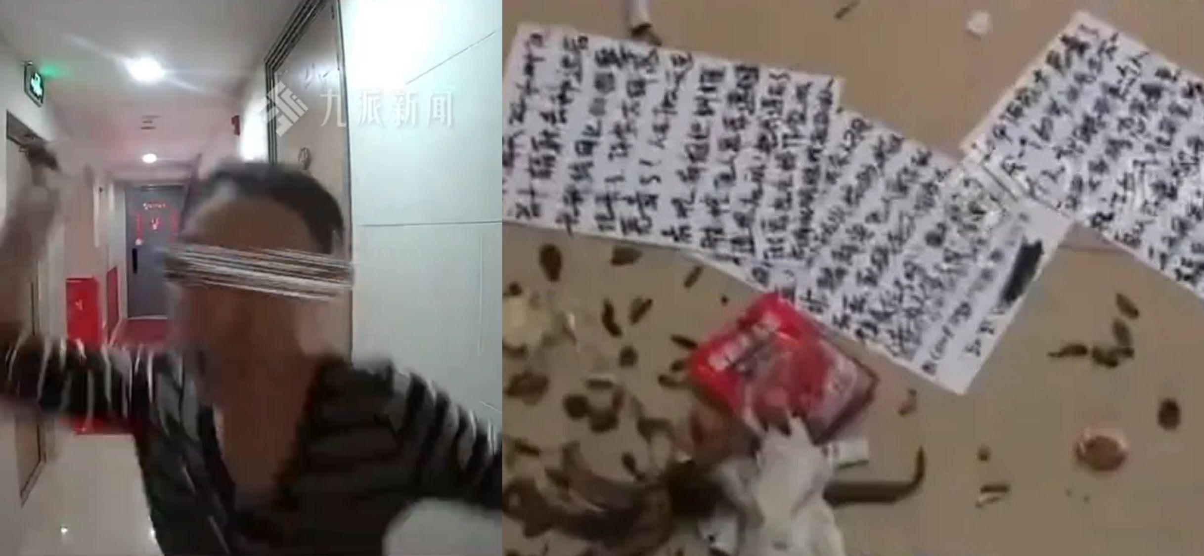 遼寧一名疑似精神障礙者的女子多次持刀上門砍鄰居的門。(圖/翻攝自《九派新聞》) 劉女稱遭到樓下疑似精神障礙者的鄰居長期騷擾。(圖/翻攝自《九派新聞》)