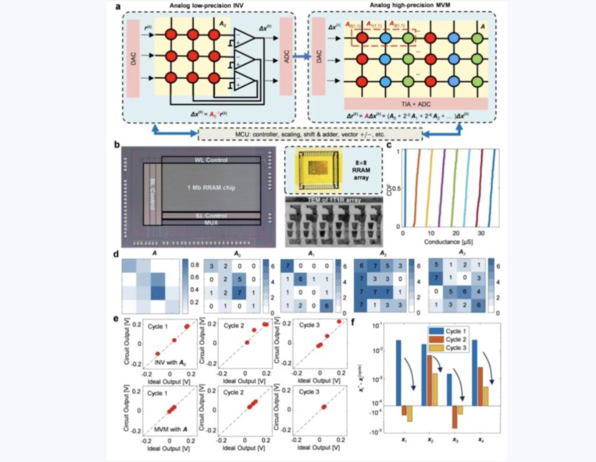 此次研發的晶片在計算精度上已實現16×16矩陣的24比特定點數精度求逆,經過十次迭代後,相對誤差可低至10⁻⁷量級。在計算性能方面,當解決32×32矩陣求逆問題時,該晶片的算力已超越高端GPU的單核性能,而在128×128的矩陣問題上,其計算吞吐量更是達到頂級數位處理器的1,000倍以上,傳統GPU一天的工作,這款晶片1分鐘即可完成,顯示出其在AI領域的巨大潛力。