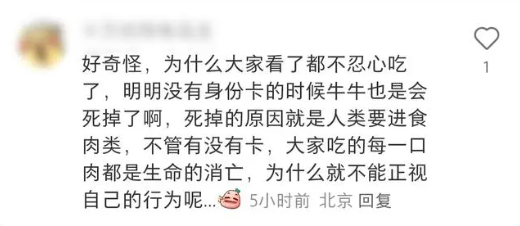 但也有網友持不同意見認為,這屬於正常行為:「為甚麽大家看了都不忍心吃了?明明沒有身分卡的時候,牛也是會死掉的。死掉的原因就是人類要進食肉類,不管有沒有卡,大家吃的每一口肉都是生命的消亡,為甚麽就不能正視自己的行為呢?」