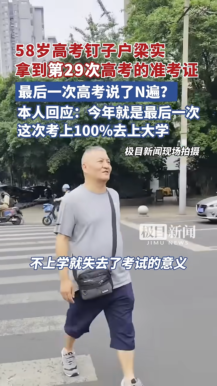 內地高考將於7日登場。四川一名58歲的「高考釘子戶」梁實也將迎來第29次考試。他5日領到准考證,預計能考500多分。他表示,目標不再局限於四川大學,只要能上一間較好的本科學校就會去讀。