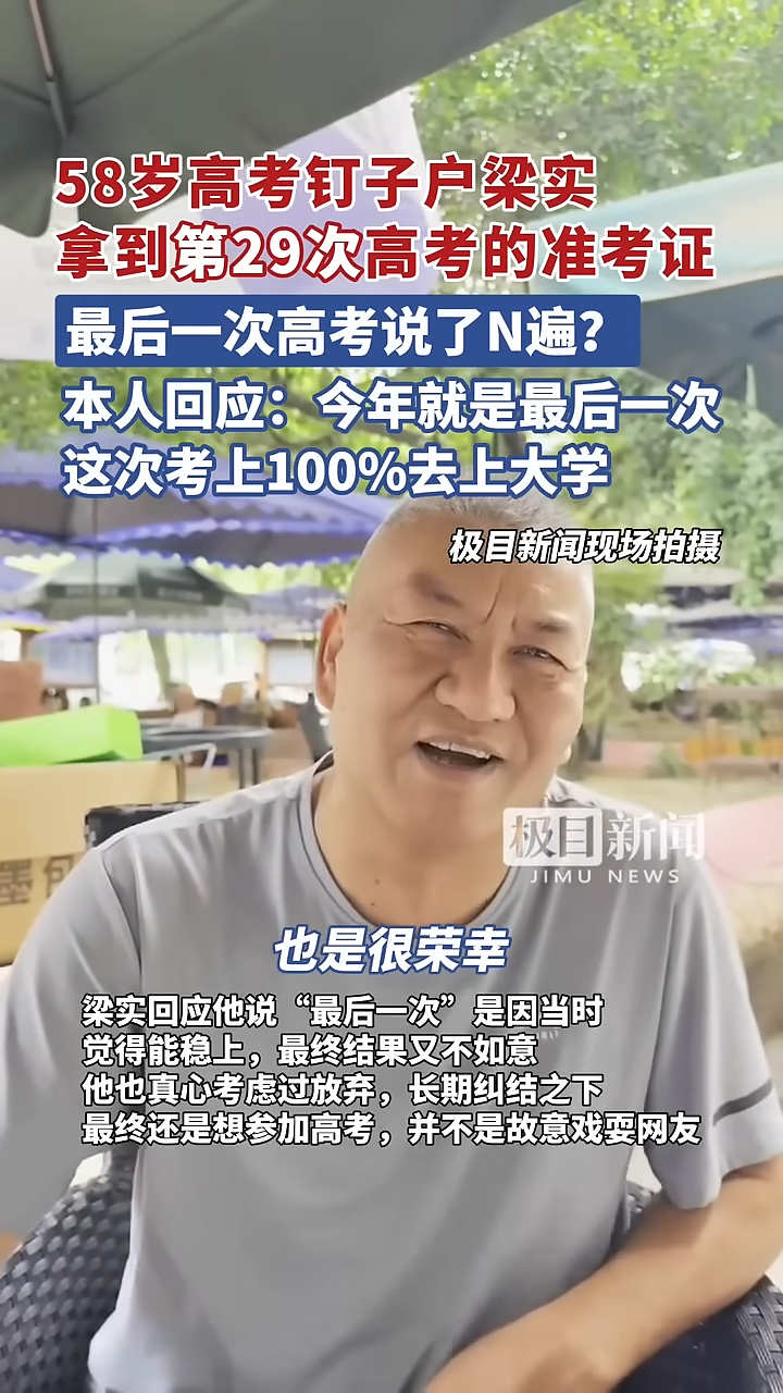 針對是否會佔用年輕考生的機會,梁實強調,高考對所有考生都是公平的,不是因年紀大,參加次數多就加分或者特招:「高考是上大學的門檻,我是因為能量不夠才連續28次沒能邁過門檻。要是我一次過,誰還會想天天被罵。」