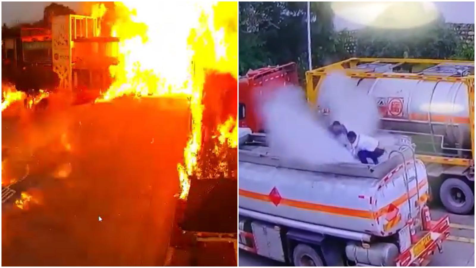 據了解,事件發生在昨天傍晚5點40分,有2名男子當下正在油罐車上忙碌,但車體上突然竄出大量白煙,煙霧越來越大,甚至把大半個休息站都覆蓋,不少人嚇得趕快跑。