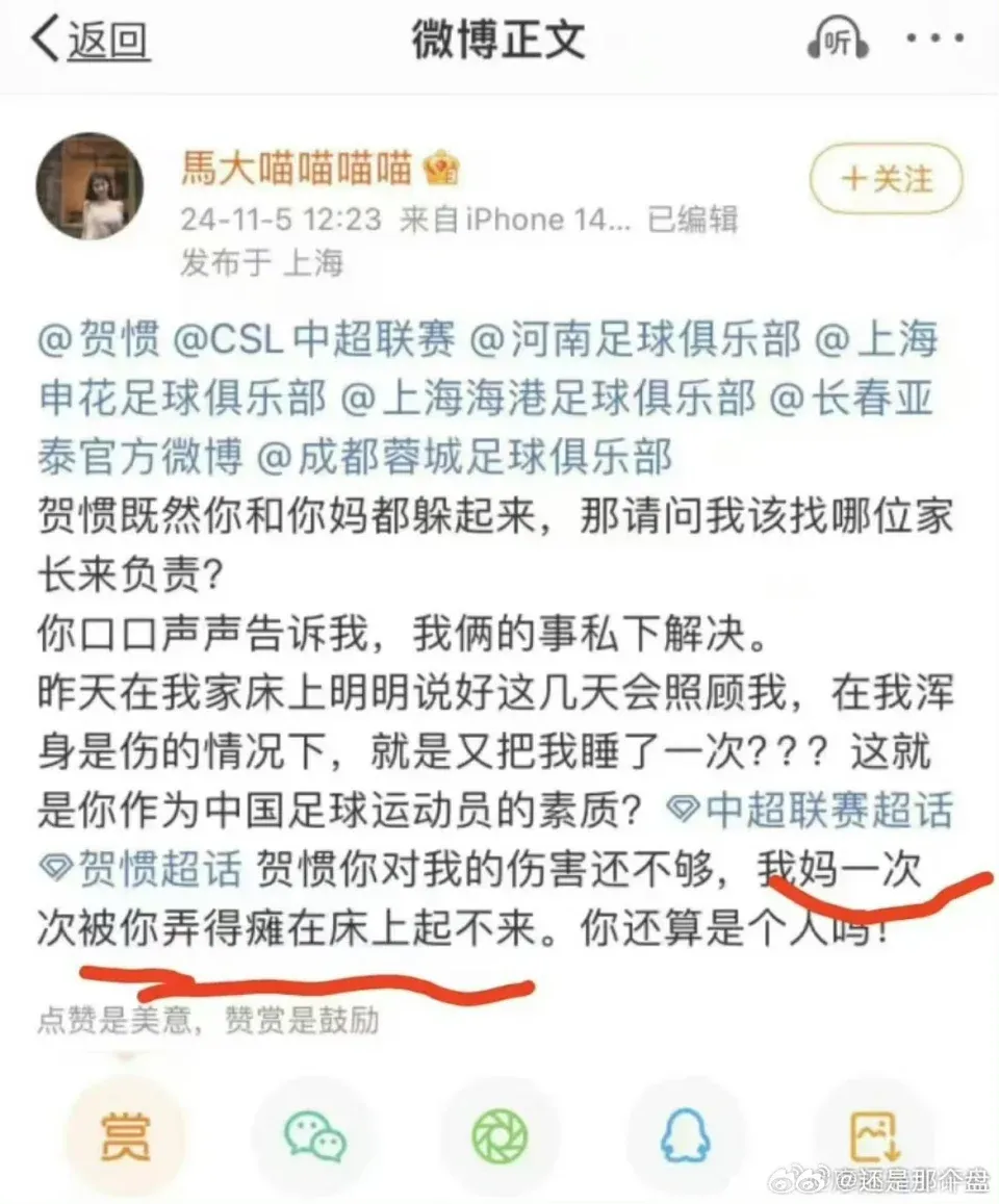 這個網名叫做「馬大喵喵喵喵」的女子在微博上披露,她與賀慣有感情糾葛,但對方卻頻頻傷害自己,她甚至被家暴,她指控,賀慣無視她的傷勢要求發生性行為,「在我渾身是傷的情況下,又是把我睡了一次」、「這就是你作為中國足球運動員的素質?」