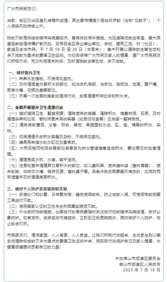 為有效控制疫情擴散,順德區、南海區及禪城區均已向市民發出《告全體市民書》,呼籲民眾利用週末時間清除蚊蟲孳生地,並進行滅蚊工作。其中,順德區特別號召轄內各企事業單位、學校、建築工地、村(社區)、家庭及全體市民,於7月19日至20日期間,集中清除蚊蟲孳生地和殺滅成蚊,以期迅速降低蚊蟲密度,阻斷疫情傳播。