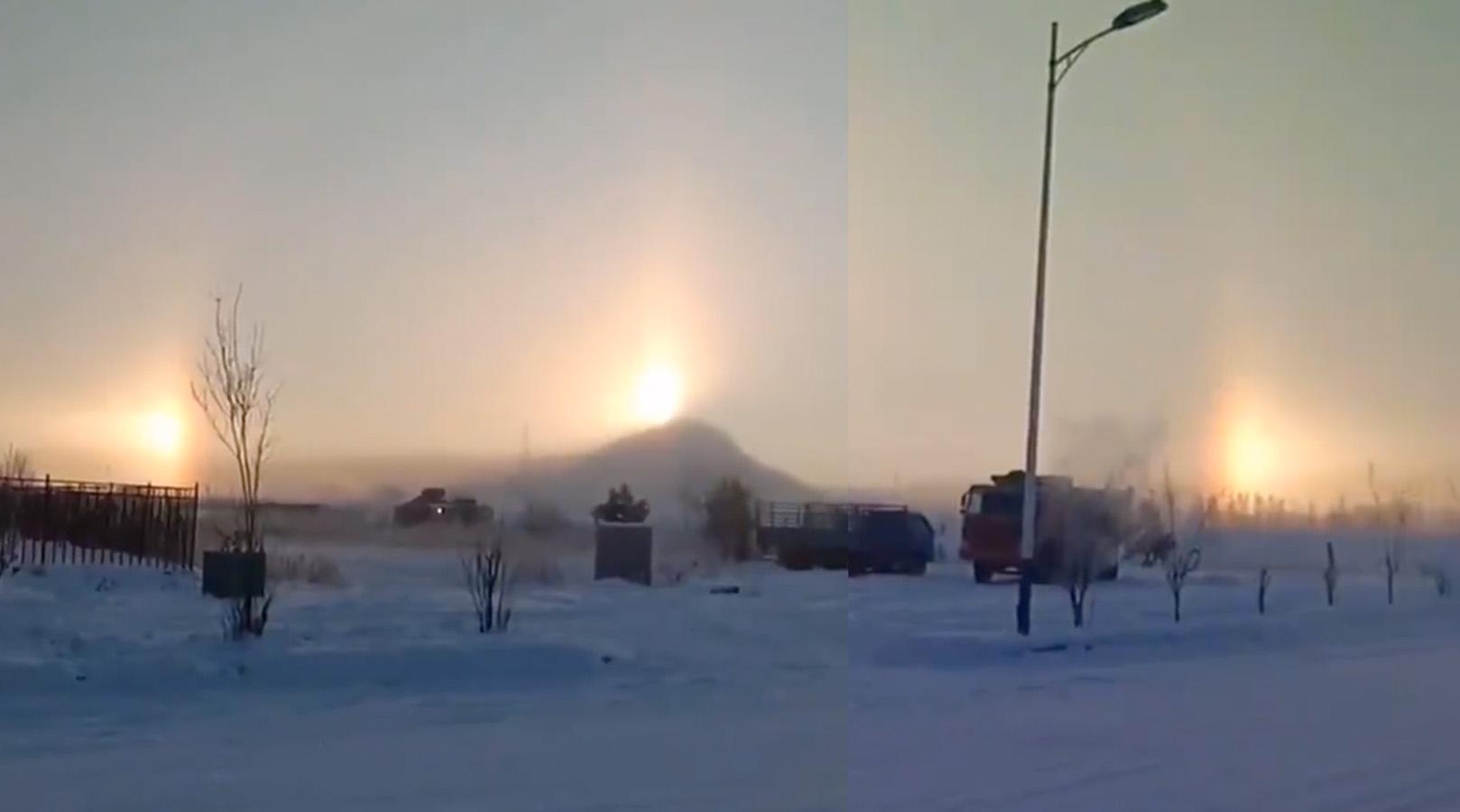 內蒙古呼倫貝爾根河市周二出現「3個太陽」。(影片截圖拼接)