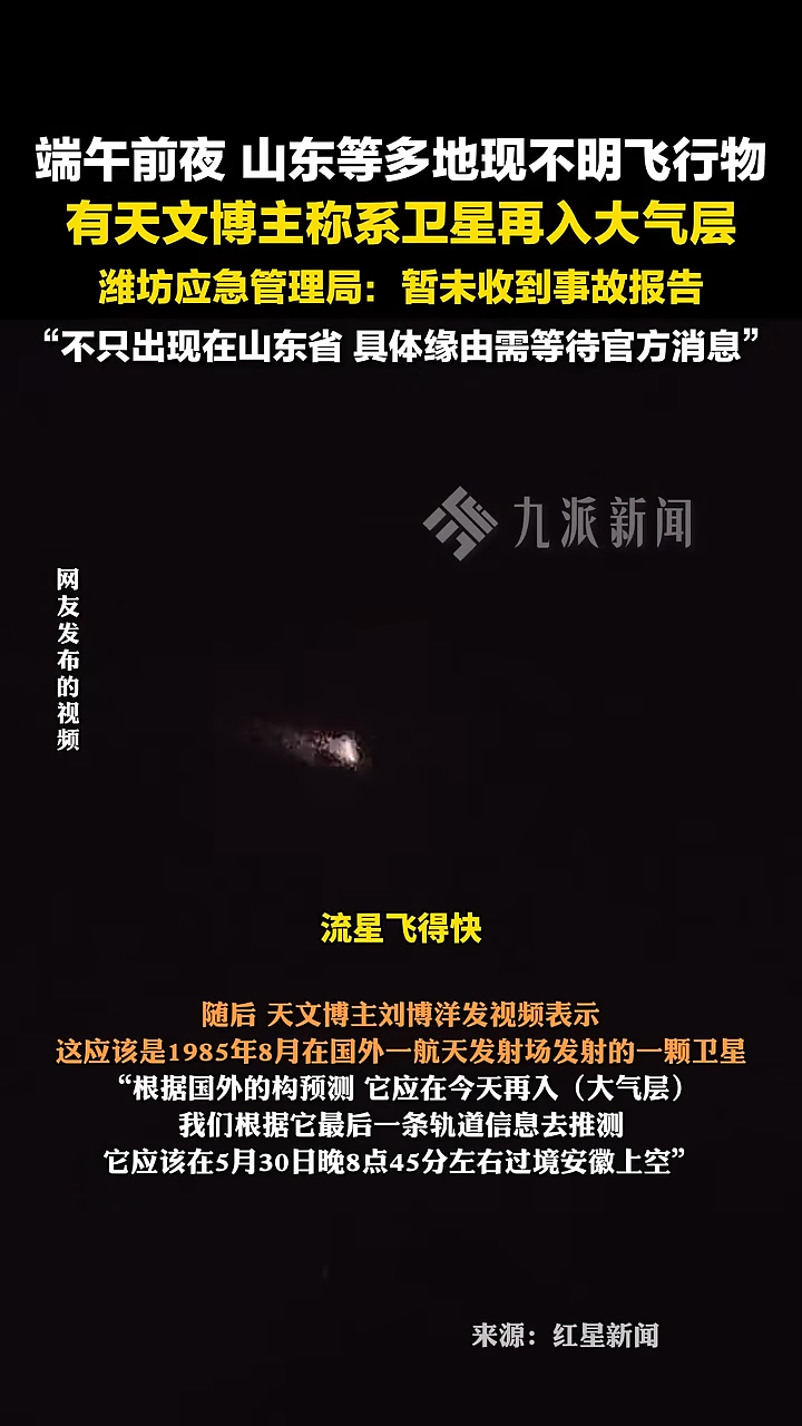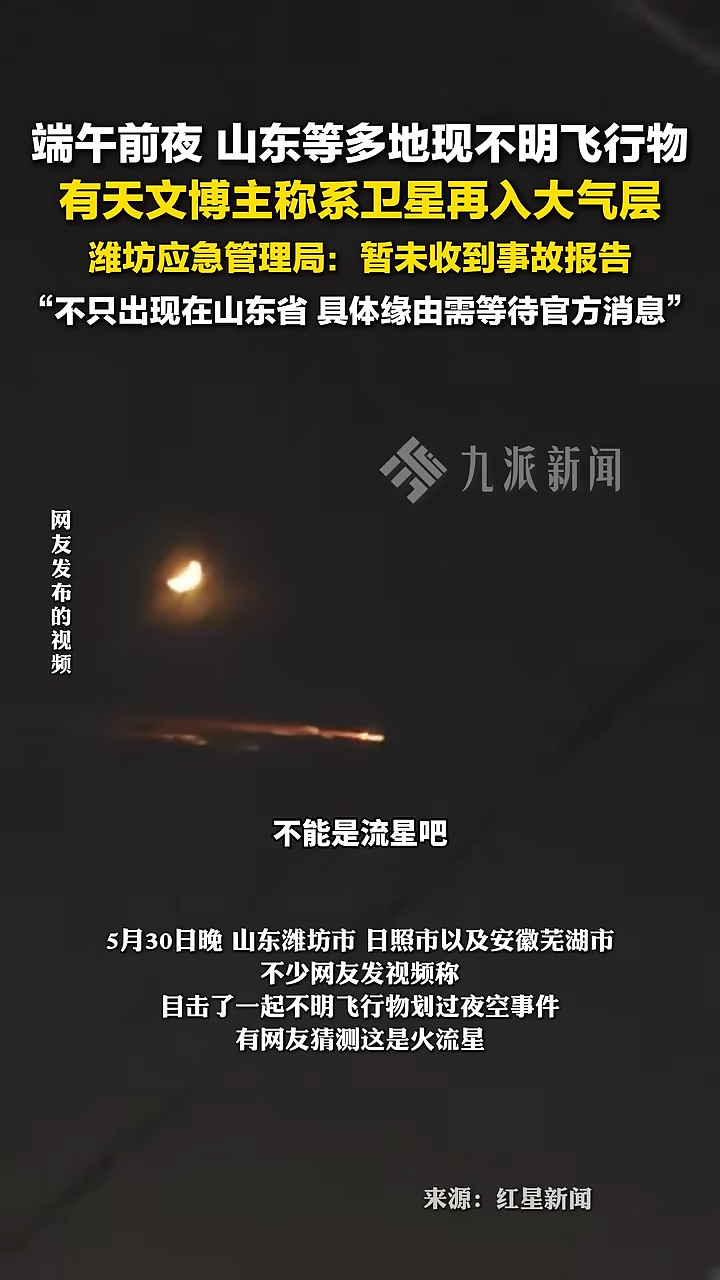 另一名山東省安丘市網友也透露,目擊不明物體飛過,並分享現場拍攝畫面:「從出現到消失大概20秒,感覺像一群帶火的光點飛過天際,特別震撼。」不止山東,江蘇、安徽等地的民眾,都目擊類似景象,引發網上熱議。