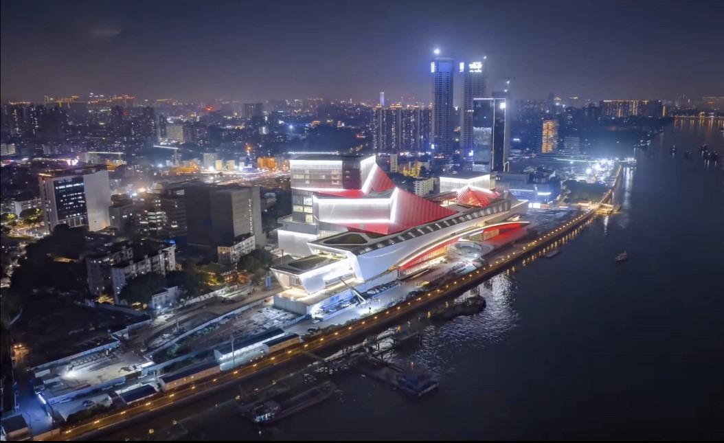 夜空下,在白鵝潭商務區核心區的珠江前後航道交匯處海面旁,一隻巨型的「天鵝」閃閃發亮,熣燦的燈光令人着迷。它就是新建成的白鵝潭大灣區藝術中心了。