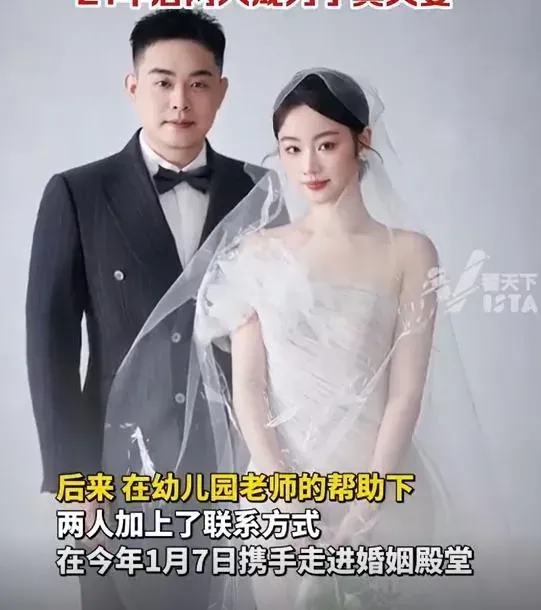 《南方日報》報道,新郎鄭姓男子表示,20年前他就讀的幼稚園,在六一兒童節舉辦表演,他被老師安排和一名小女生演一對新人。表演當天,他穿着咖啡色西裝,小女生穿着一襲白紗和紫色頭冠,兩人笑咪咪在舞台上,模樣十分天真可愛。