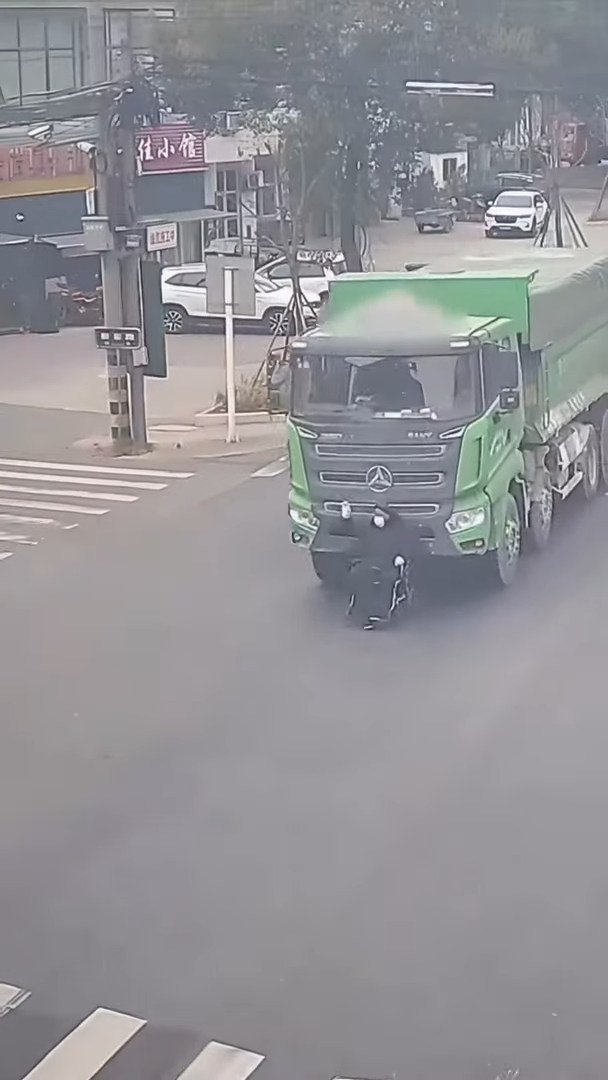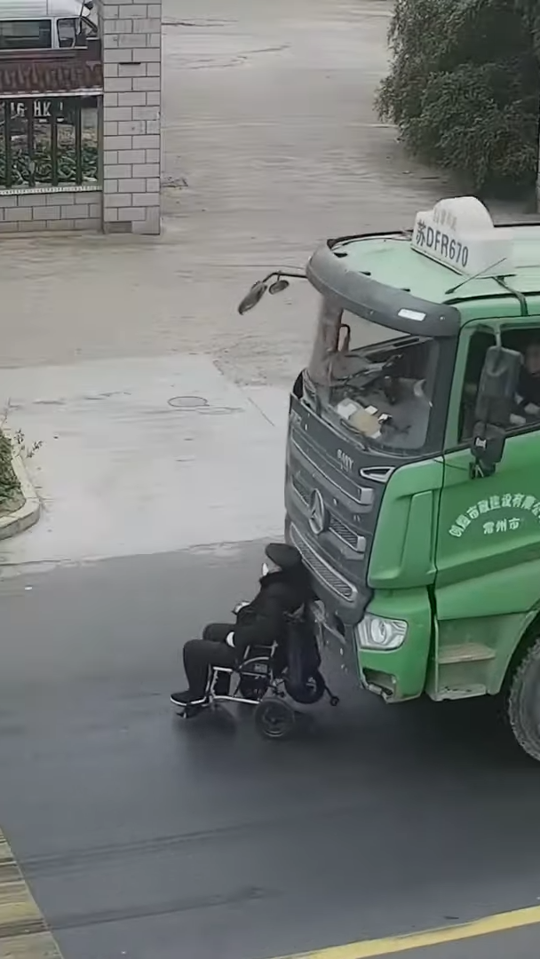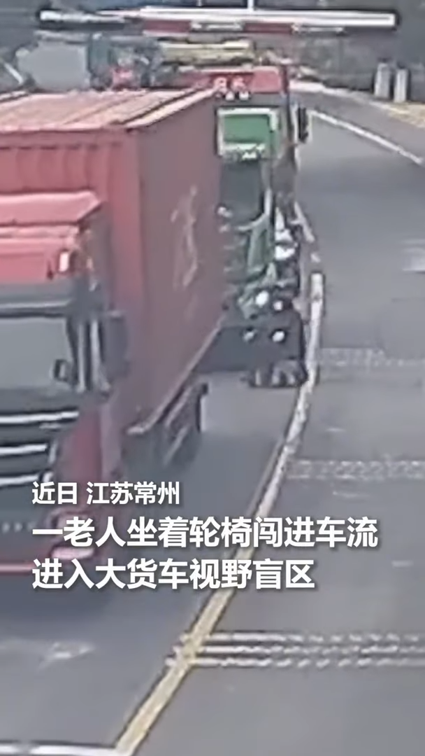 根據《央視新聞》與《北京青年報》,這驚險一幕發生在本月20日上午10時許,常州經開區橫山橋鎮戚月線新董路口。一名乘坐電動輪椅的8旬老翁忽視前方不遠處的斑馬線,直接鑽入車陣當中,想從大貨車中間的縫隙鑽過去,不巧落入一輛綠色大貨車的視線死角。