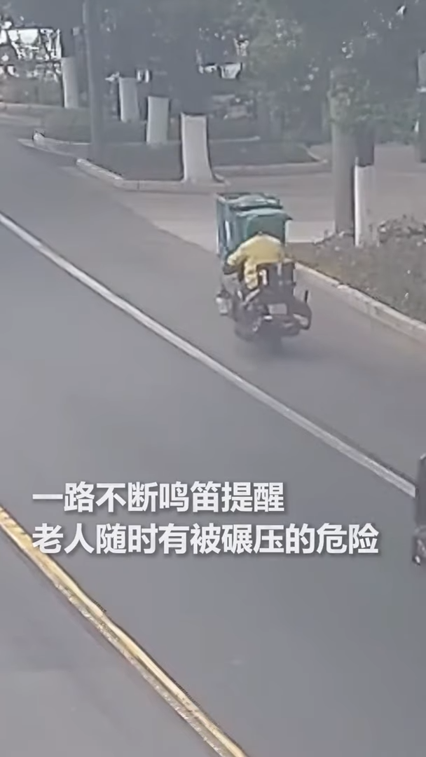 當號誌變成綠燈後,一排大車緩緩啟動前行。影片畫面顯示,貨車司機未察覺輪椅老翁就在車前,便將老人連同輪椅一路向前推行數百米。期間老翁還舉手疑似在求救。千鈞一髮之際,一名黃衣電單車手發現異狀,果斷掉頭追趕並猛按喇叭示警,最後成功攔停大貨車,救了老人一命。