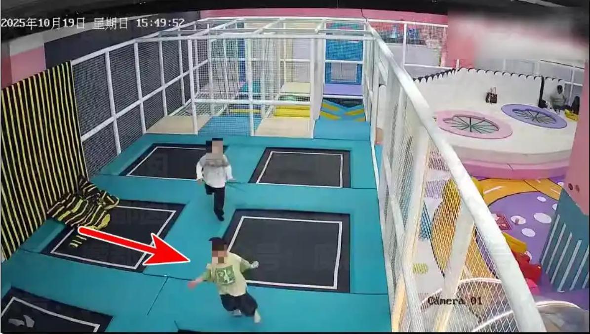 綜合內媒報道,閉路電視畫面顯示,10月19日下午3時49分,兩名孩子在彈翻床遊樂區內追逐玩鬧。3時51分,身穿綠衣的兒童突然跌倒坐下,隨後踉蹌走至一遊樂設施後方。白衣兒童見狀跑去查看,畫面中可見綠衣兒童掙扎後倒在彈跳床處,整個過程約30秒。隨後白衣女子和黑衣女子趕到現場,將綠衣兒童抱出監控範圍。
