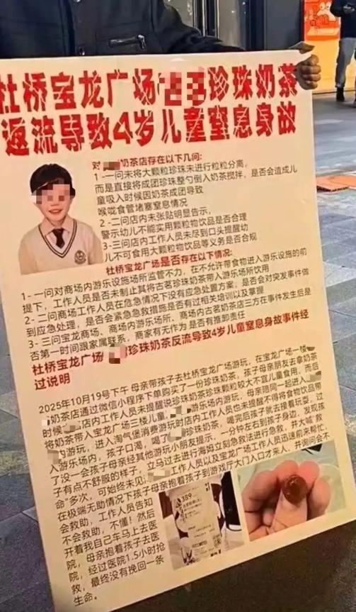 據自稱是孩子父親的網友在網上發文表示:「孩子2022年6月出生,2025年10月19日下午6時死亡,死亡原因為珍珠奶茶窒息死亡;地點是杜橋寶龍廣場三樓遊樂園」。他希望自己家的遭遇能給大家帶來警惕。該網友還發布影片展示珍珠奶茶的黏性,質疑珍珠顆粒黏性如此強烈,兒童是否適合飲用。