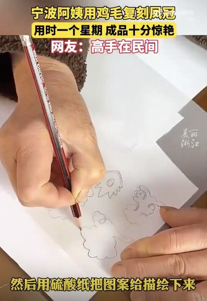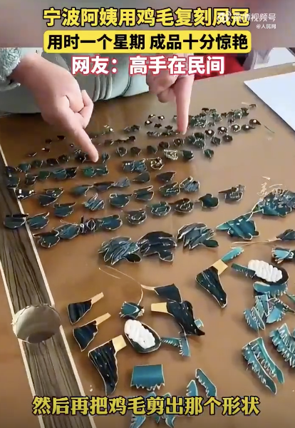 浙江省寧波市一名大媽,只用10天時間,巧手把野雞羽毛變成鳳冠,步驟包括處理雞毛、製作鳳冠架子、貼花片、貼珍珠、掐絲等,做好的鳳冠光彩熠熠,令人驚嘆。