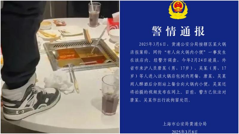 3月8日,上海市公安局黃浦分局發布通報稱,對兩名17歲男子作出行政拘留的處罰。3月12日,海底撈發布長文,對4109單顧客全額退還當日餐費,並額外提供訂單付款10倍金額的現金補償。若按每單500元價格計算,餐費金額即超過200萬元,補償金額將超過2000萬元。