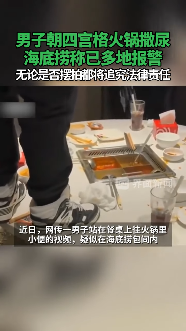 最近一段影片在網上瘋傳,可以看到有一名身穿黑色褲子的男子,竟然毫不客氣地站在海底撈的桌子上,接着朝着看起來還在冒煙的熱湯裏撒尿,一粒粒的水珠不停落下,雖然沒有看到水珠真的是從他的尿道排出,但光是站在桌上的行為,就已經有欠公德。