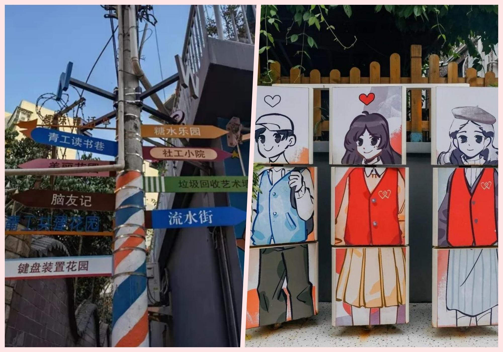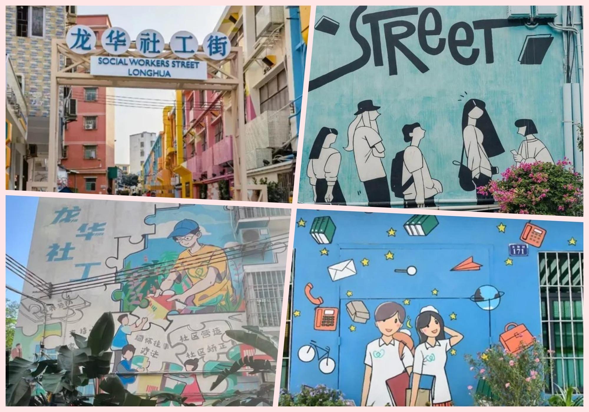 在大和站旁,就有一個充滿色彩的村落,名字還挺有意思,叫作「龍華社工街」。「龍華社工街」是真的由一群社工建造的,是深圳第一條「黨建+社工」為主題的步行街,匯聚了社工行業精英,開展社區治理工作。