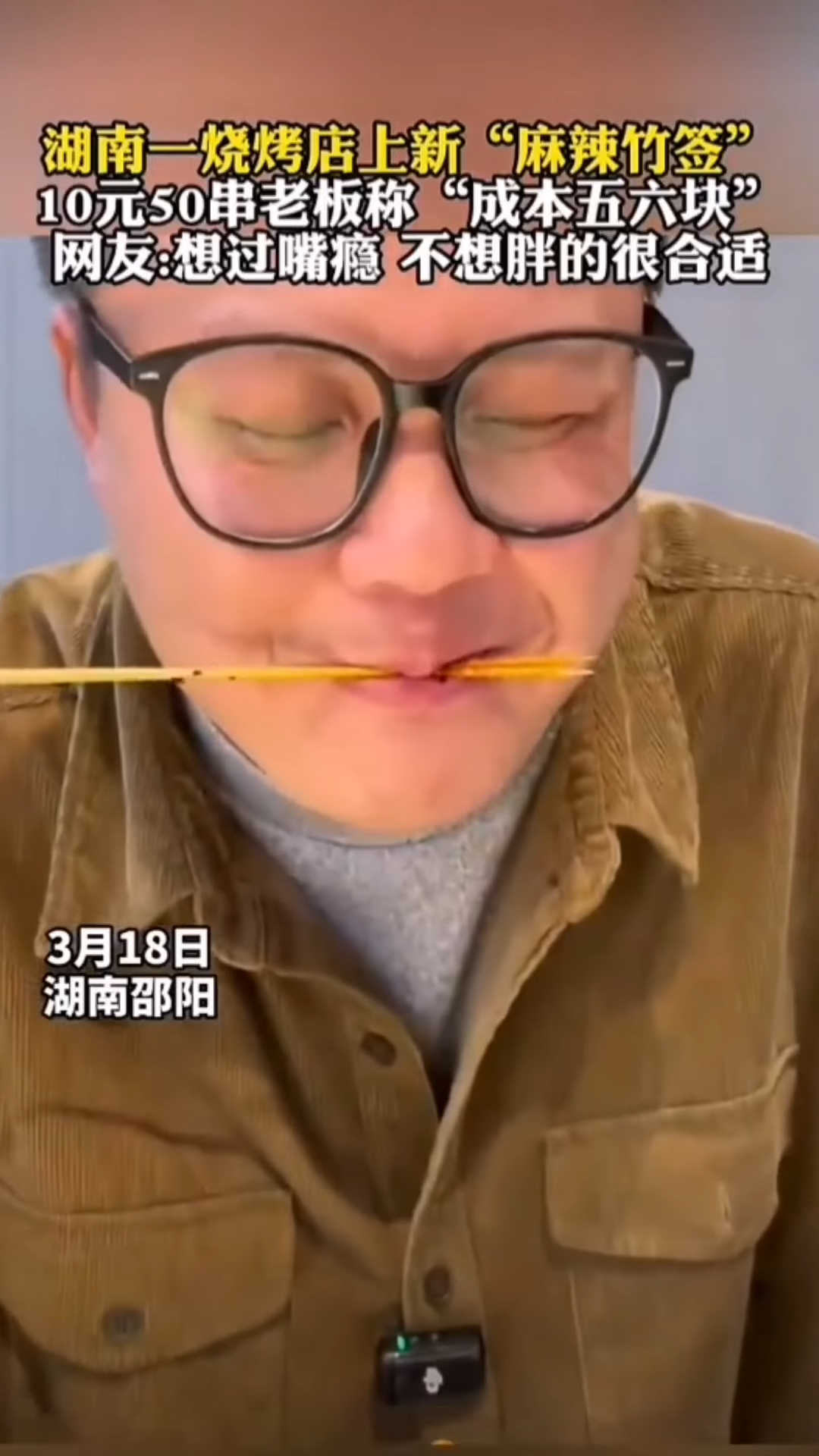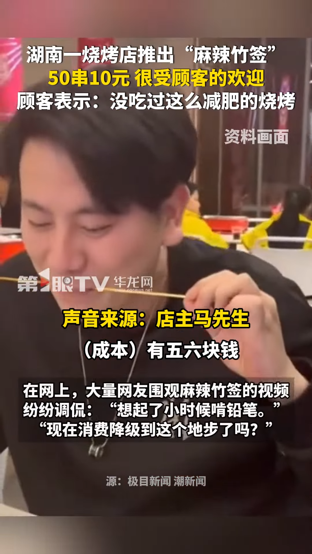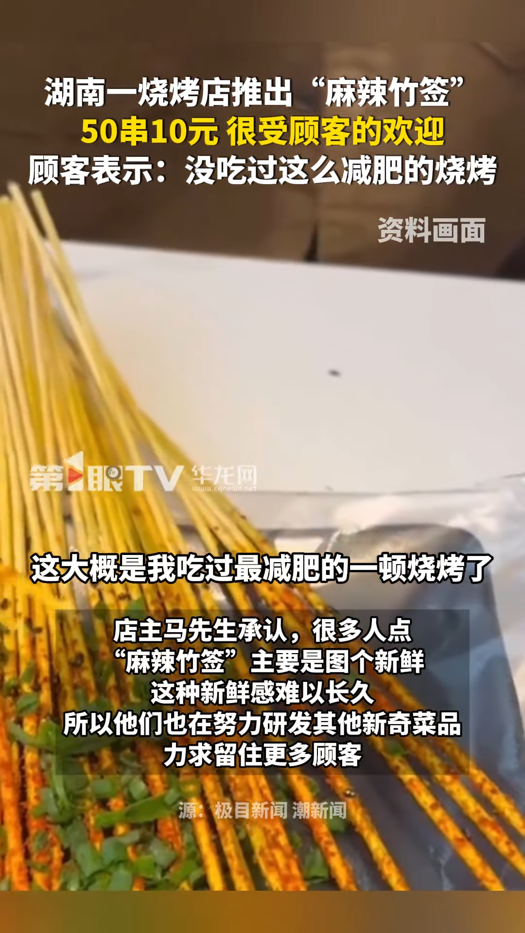 近日,湖南省邵陽的一家串燒餐廳推出創意菜式「麻辣竹籤」,竹籤上沒有食材,僅撒上蔥和調味料,平均每串售價0.2元人民幣(約0.21港元),意外爆紅,尤其受到女顧客的青睞,每日最高能賣上百份。
