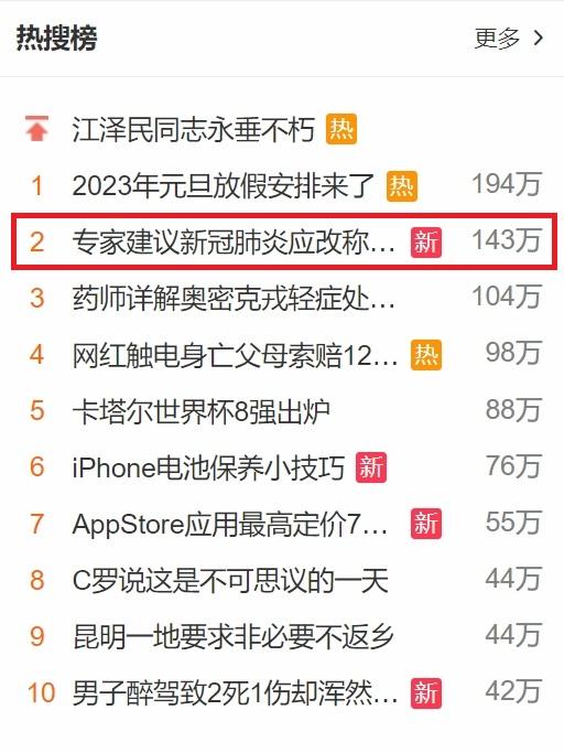 「專家建議新冠肺炎應改稱新冠病毒傳染病」登上微博熱搜第二位。