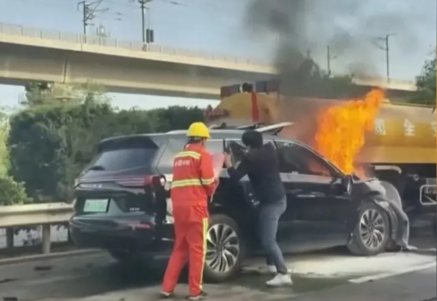華為電動車問界M7追撞前方的灑水車後起火。(互聯網)