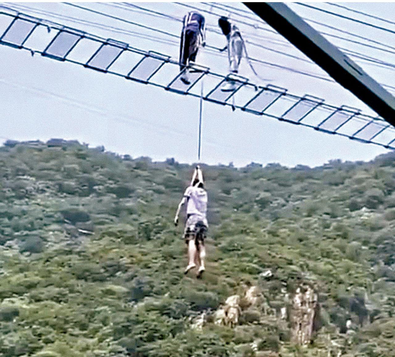 根據網上流傳片段,九山頂景區的昏迷遊客半天吊,半身式安全帶卡在腋下(圖1),工作人員在橋上扯安全帶,將遊客扯近橋面時,安全帶突然鬆脫,遊客直墮數百米深谷;地心谷景區的男童失足後,半身式安全帶脫離身體,男童雙手緊抓著安全帶(圖2),工作人員亦試圖捉著男童的手,但最終男童力竭,工作人員只捉到男童的衣服,男童瞬間跌入樹叢。