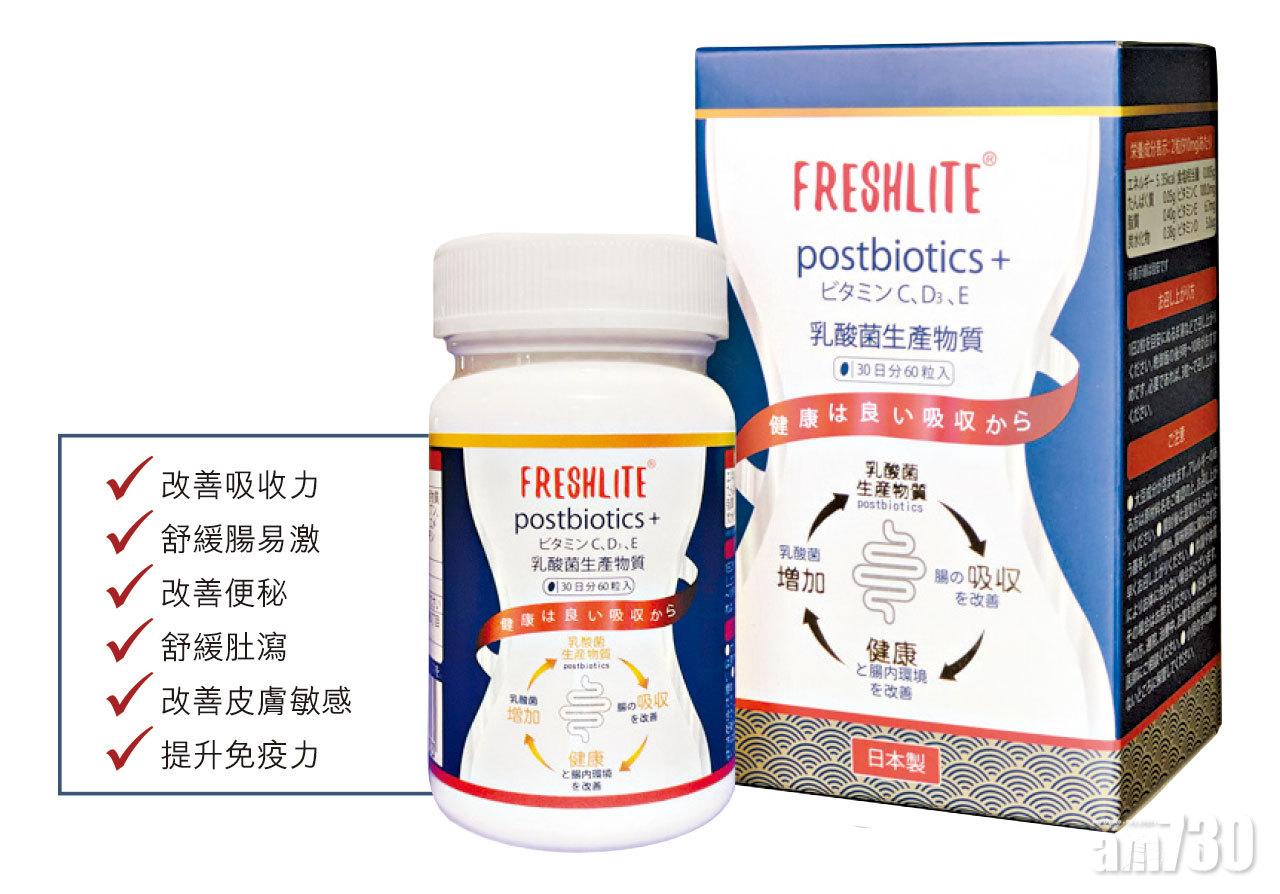 Freshlite postbiotics+(日文名:乳酸菌生產物質)以益生菌精華素為主成分,按日本70多年的科研成果和專利技術,在模擬人體腸道環境中,培育35種益生菌菌種,萃取其分泌的300多種關鍵營養素而成。具有多種對腸道健康有幫助的功效: